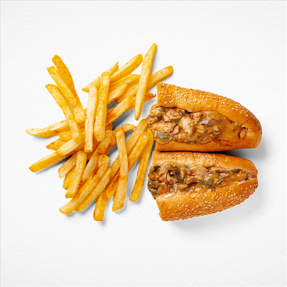 Куриное филе, грибы, сыр гауда, перец болгарский, майонез, авторская булочка, порция фри.