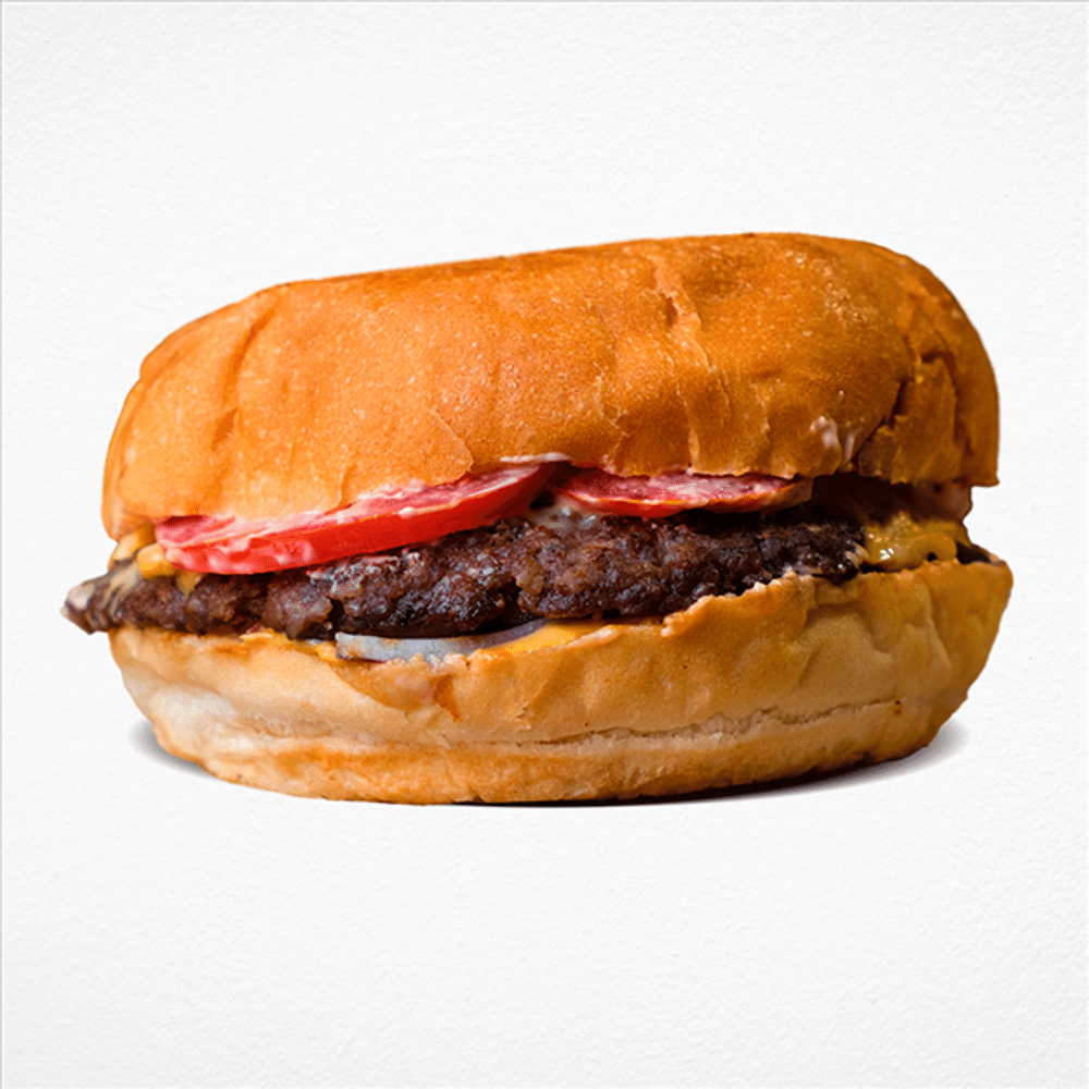 Котлета из 100% говядины, 3 порции сыра чеддер, репчатый лук, помидор, огурец маринованный, коктейльный фирменный соус, авторская булочка!