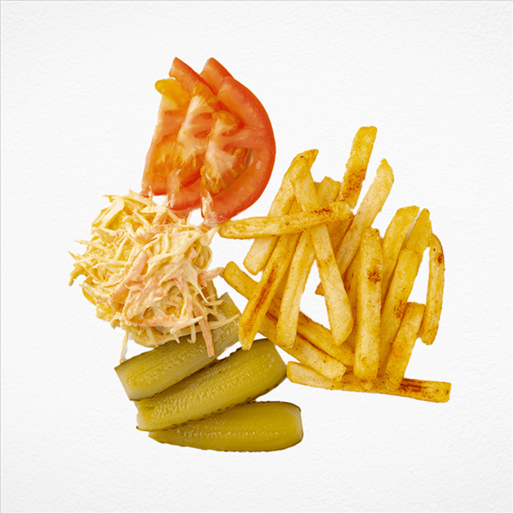 Cалат Коул-Слоу, чесночный соус, свежий помидор, картошка фри, маринованные с ароматными специями огурцы и ломтики.